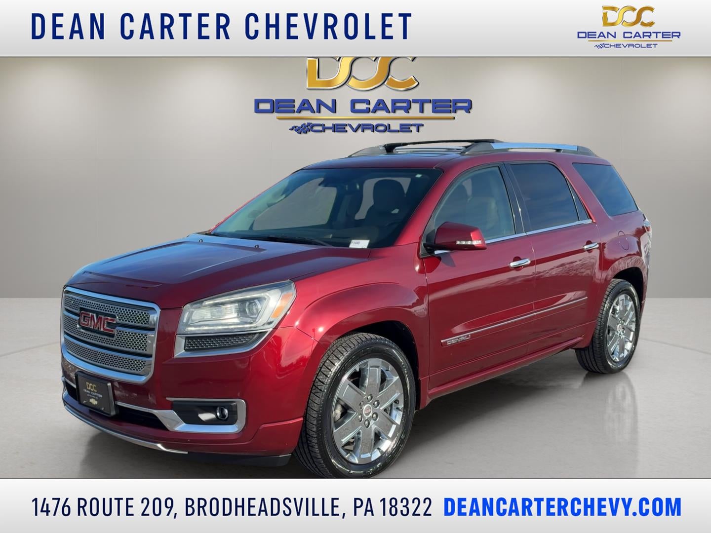 Welcome to Dean Carter Chevrolet! We're out to change the way you feel about the car buying experience, and proud to offer our local communities in Monroe County the very best in quality, price, selection, and service. Take this 2015 GMC Acadia Denali for example.... Offered in Crimson Red Tintcoat exterior with Cocoa Dune interior, it's certain to make a great addition to your family or business! Be sure to take note of all this vehicle has to offer: No Accidents! Important/Valuable Packages & Equipment Preferred Equipment Group 5SAPerforated Leather-Appointed Seat Trim2-Position Memory For Driver's Seat Adjuster7-Passenger Seating (2-2-3 Seating Configuration)8-Way Power Driver Seat8-Way Power Passenger Seat AdjusterPower Windows with Driver Express-Up and -DownDenali Specific Body-Color Rocker MoldingBody-Color Moldings with Chrome InsertDenali Specific Illuminated Sill PlatePremium Carpeted Front 2nd and 3rd Row Floor MatsDenali Specific Acoustic Insulation PackageRemote Vehicle StartDual SkyScape 2-Panel Power SunroofTri-Zone Automatic Climate ControlInside Rearview Auto-Dimming MirrorHeated Power-Adjustable Outside MirrorsHeated and Cooled Front SeatsLeather-Wrapped Steering Wheel with Wood TrimPower Tilt and Telescopic Steering ColumnDenali Specific Dual Flow Through Fascia ExhaustVariable Effort Power SteeringTechnology PackageP255/55R20 H-Rated BW TiresPower Rear Liftgate BodySide Blind Zone Alert and Rear Cross Traffic AlertUniversal Home RemoteRear Audio System ControlsBose Premium 10-Speaker Audio SystemHeated Leather Wrapped Steering WheelForward Collision Alert and Lane Departure WarningDenali Specific Bright Side Rails Luggage RackTrailering EquipmentDenali Specific Front Fascia Comfort Ventilated front seats -Thats cool. Ventilated front seats provides targeted cool air so you and your passenger can get comfortable quicker in hot weather. Getting comfortable is no sweat when you have ventilated front seats.Convenience Cruise control with steering wheel mounted controls. Set it and forget it. Road trips used to be stressful, until cruise control set the pace. Simply set the desired speed using the steering wheel mounted controls and it will maintain that speed without driver intervention. This can help minimize driver fatigue and improve overall fuel economy. Resting your right foot is right at your fingertips thanks to cruise control with steering wheel mounted controls. Power open and close liftgate - On-demand access. When your arms are full of cargo, the last thing you want to do is set it all down just to open the liftgate, then pick it all back up to load it in. By remotely opening and closing, power liftgate lets you skip straight to the loading. It also eliminates the awkward stretch to reach up for the liftgate to close it. Load and go with power open and close liftgate.Safety and Security Rear camera - Watching your back! The rear camera helps you see obstacles and hazards you otherwise couldn't by showing enhanced images of what is behind you. The rear camera is an extra set of eyes that's both convenient and safe. Head-up display - Keep your head up! You don't have to take your eyes off of the road to get information from your dashboard anymore. With head-up display, important driving information - like speed and RPM's - displays on your windshield in your line of sight. Because when you're driving, the most important information lies on the road ahead. Keep your eyes on the road with head-up display. Brake assist - Stop right there. Something jumps out into the middle of the road and you need to stop now! With brake assist, you will. It uses the speed of the brake pedals travel to sense panic braking, then applies all available power to boost your stopping power. Brake assist can stop the accident before it is one.Technology and Telematics Selective Internet access - a more focused delivery. Selective internet access allows you to tailor the features for your feed, such as sports scores, local news,
