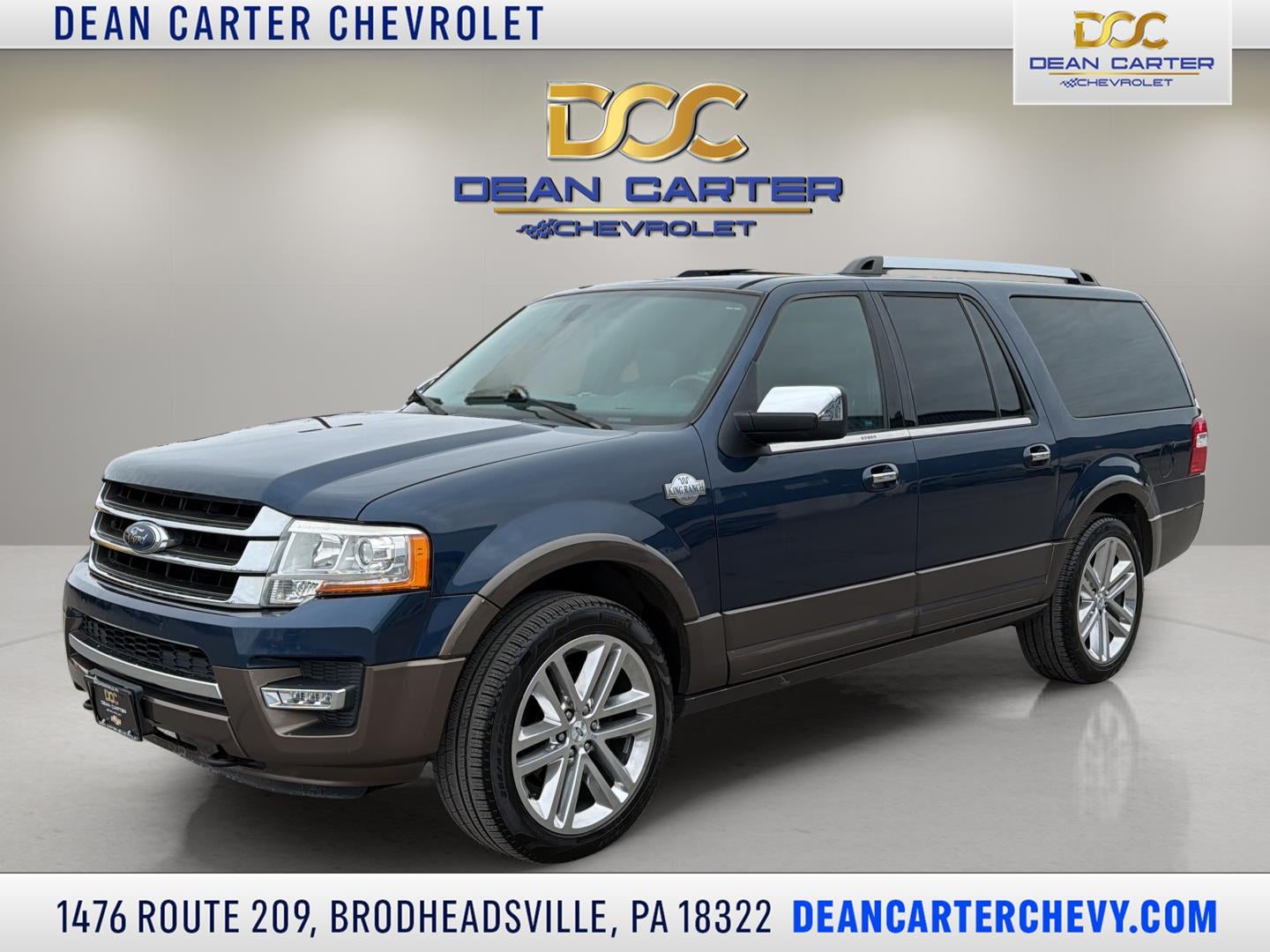 Welcome to Dean Carter Chevrolet! We're out to change the way you feel about the car buying experience, and proud to offer our local communities in Monroe County the very best in quality, price, selection, and service. Take this 2017 Ford Expedition EL King Ranch for example.... Offered in Blue Jeans exterior with Mesa w/Ebony interior, it's certain to make a great addition to your family or business! Be sure to take note of all this vehicle has to offer: No Accidents! One Owner! Important/Valuable Packages & Equipment Equipment Group 401A6-Speed Automatic Transmission with SelectShiftVoice-Activated Touch-Screen Navigation System3.5L EcoBoost V6 EngineHeated and Cooled Perforated Leather Front Bucket SeatsPower-Deployable Running Boards7,760 lbs Payload Package GVWRPremium Sony Sound System with Single-Disc/MP3P275/55R20 AS BSW Tires20" Bright Machined Aluminum WheelsLimited Slip with 3.73 Axle Ratio Comfort Ventilated front seats -Thats cool. Ventilated front seats provides targeted cool air so you and your passenger can get comfortable quicker in hot weather. Getting comfortable is no sweat when you have ventilated front seats.Convenience Cruise control with steering wheel mounted controls. Set it and forget it. Road trips used to be stressful, until cruise control set the pace. Simply set the desired speed using the steering wheel mounted controls and it will maintain that speed without driver intervention. This can help minimize driver fatigue and improve overall fuel economy. Resting your right foot is right at your fingertips thanks to cruise control with steering wheel mounted controls. Power open and close liftgate - On-demand access. When your arms are full of cargo, the last thing you want to do is set it all down just to open the liftgate, then pick it all back up to load it in. By remotely opening and closing, power liftgate lets you skip straight to the loading. It also eliminates the awkward stretch to reach up for the liftgate to close it. Load and go with power open and close liftgate.Safety and Security Rear camera - Watching your back! The rear camera helps you see obstacles and hazards you otherwise couldn't by showing enhanced images of what is behind you. The rear camera is an extra set of eyes that's both convenient and safe. Brake assist - Stop right there. Something jumps out into the middle of the road and you need to stop now! With brake assist, you will. It uses the speed of the brake pedals travel to sense panic braking, then applies all available power to boost your stopping power. Brake assist can stop the accident before it is one.Technology and Telematics Selective Internet access - a more focused delivery. Selective internet access allows you to tailor the features for your feed, such as sports scores, local news, or current weather. When it comes to getting what you want, selective internet access is a net gain. Voice activated integrated navigation system - A to B made easy! Whether it's an errand or a road trip, the voice activated integrated navigation system will guide you to your destination. No more bulky, impossible-to-fold maps, and no more stopping to ask for directions. Just tell it where you want to go, and the voice activated integrated navigation system shows you the right way. Other Notable Features/Options ENGINE: 3.5L ECOBOOST V6, BLUE JEANS To verify availability of this vehicle please contact our client care team at 570-992-0200 or stop by see us at 1476 Route 209 Brodheadsville PA 18322. Let us show you why Dean Carter Chevrolet is the dealership you can trust...now and in the future.